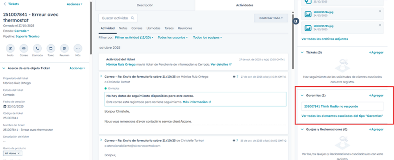Cuando estamos dentro del ticket, vamos a la columna de la derecha, al apartado “Garantías” y le damos a “Agregar”
